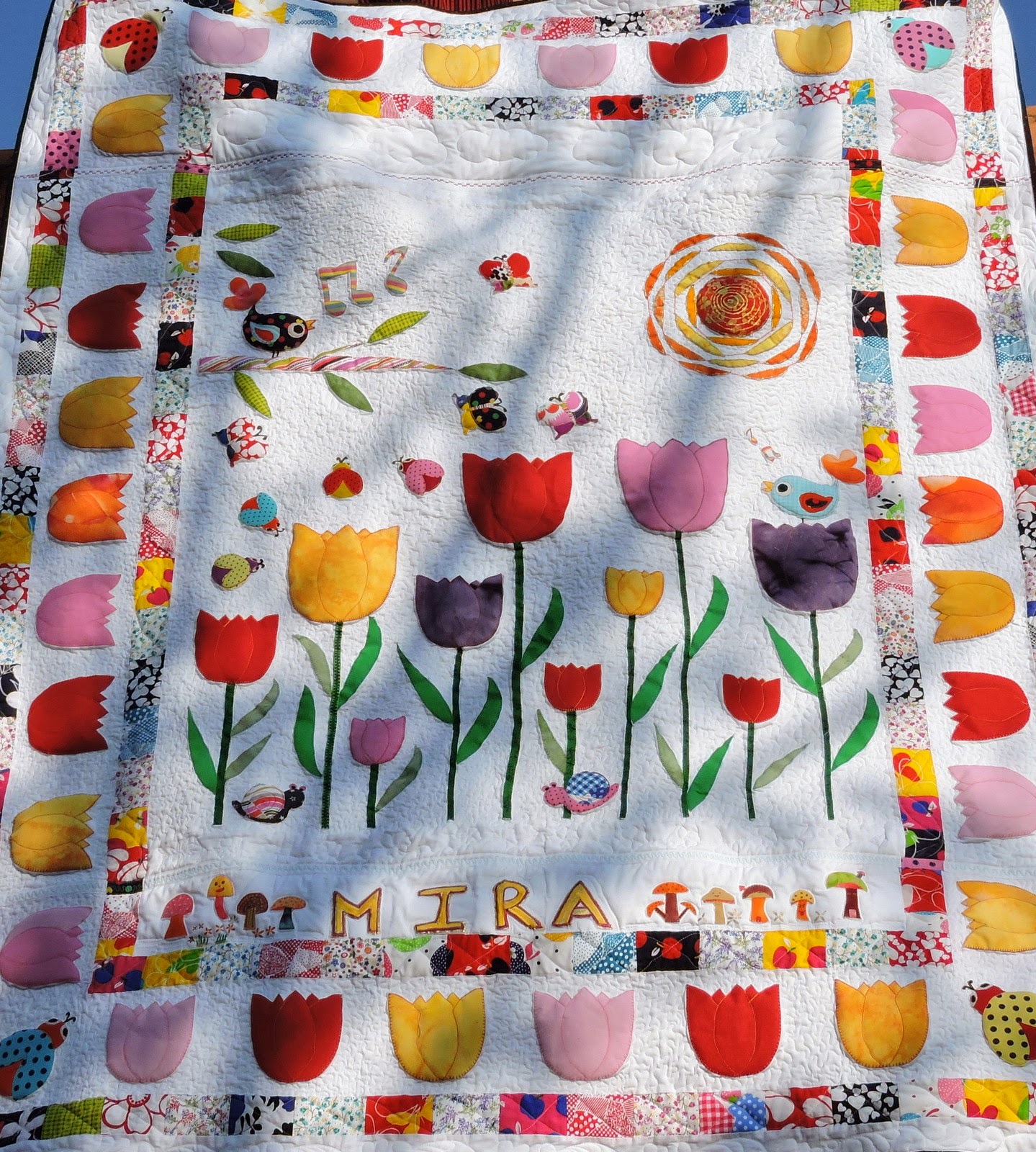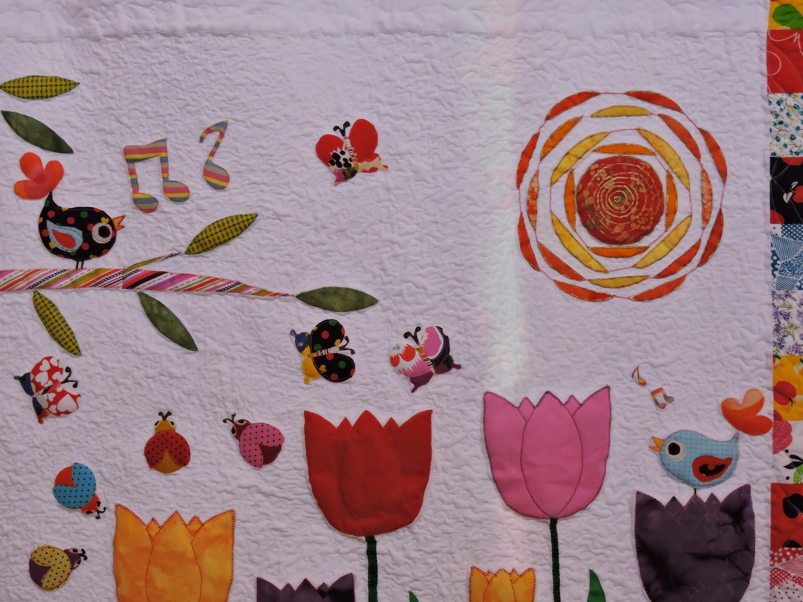 This one has been in the making for a while. I had to put it away couple of times to accommodate other quilts and projects and also because my sewing machine had minor fits of tantrums when asked to do a lot of FMQ. Well I am not one to give up easily and after multiple changes of needles and thread and freshly wound bobbins, It is all done.