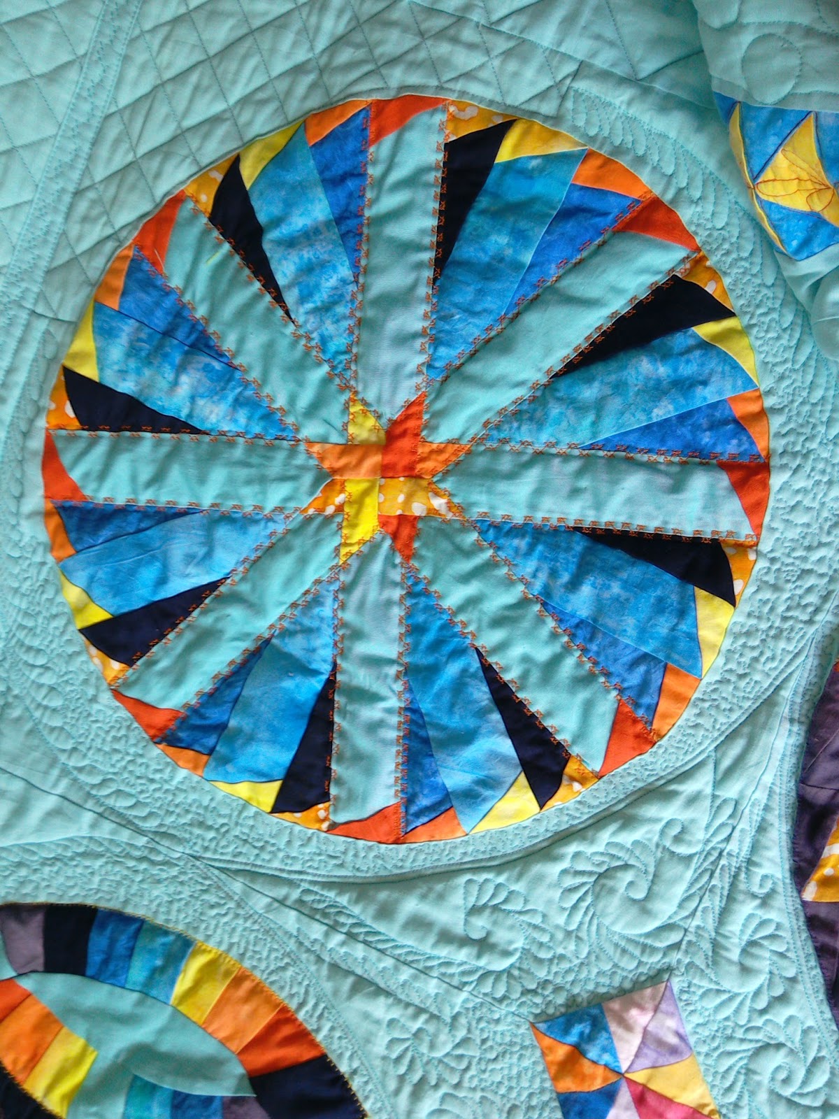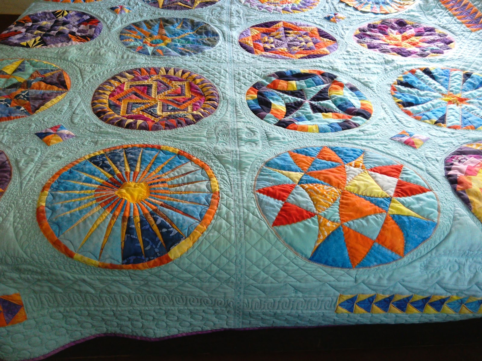 DeleteThere is so much awesome in this quilt! What beautiful work!! I really love all the bright colors and the blue background. The quilting is amazing as well! :-)