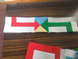 For the centre which is made of all the colours, cut 5" squares in each colour. Lay any two colours, right side facing and sew up to make a half square triangle as described here. Do the same with the other set of colours. Take one each of the resulting HST and again following the same method sew up to get a QST in 4 different colourṣ. I missed taking pictures at this stage. Trim carefully to get a square measuring 3.5". You can see that I trimmed too much on one side and too less on the other. Make sure the diagonals meet at the corners.